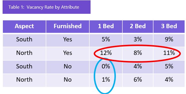 For example, we might find that: Furnished 1 bedroom apartments can charge a premium of 20% versus unfurnished apartments, whereas furnished 2 bedroom apartments can only command a premium of 5%. This becomes even more challenging when we overlay the aspect, furnishing, bedrooms, balconies etc on top of each other.