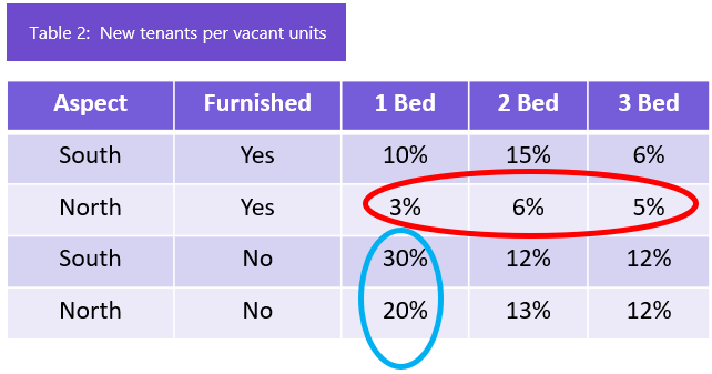 Tables 1 and 2 both tell a similar story: There are large disparities across the tables. Clearly the north facing furnished apartments are being priced too high, while the unfurnished apartments are being priced too low. The tweaks required for other apartments are more subtle, however should not be overlooked.